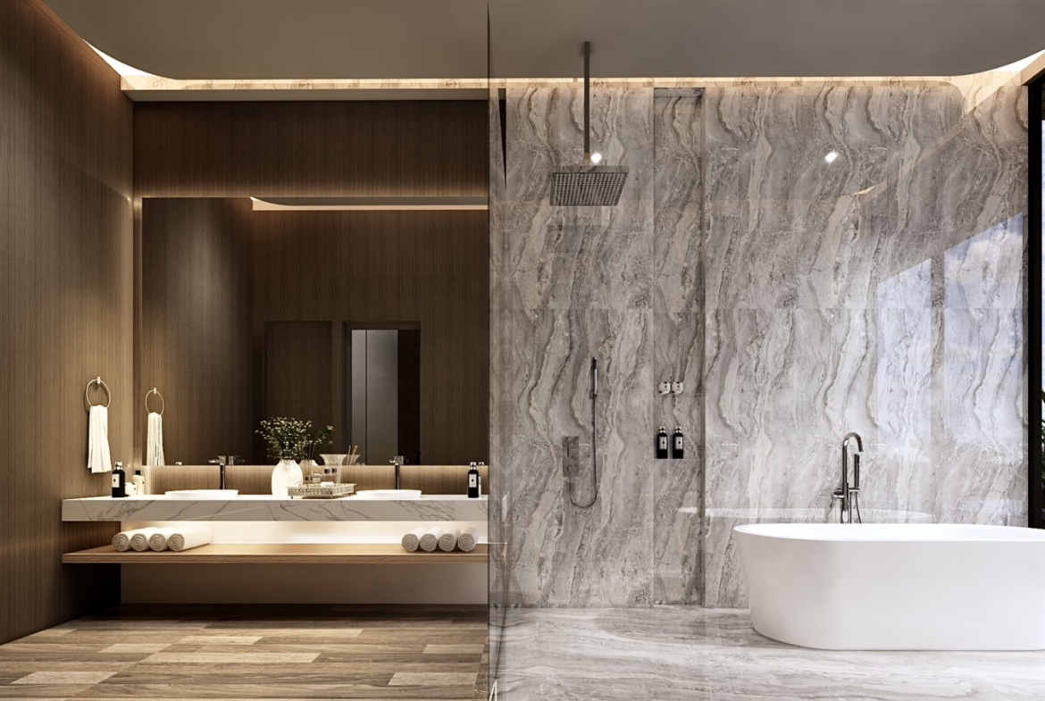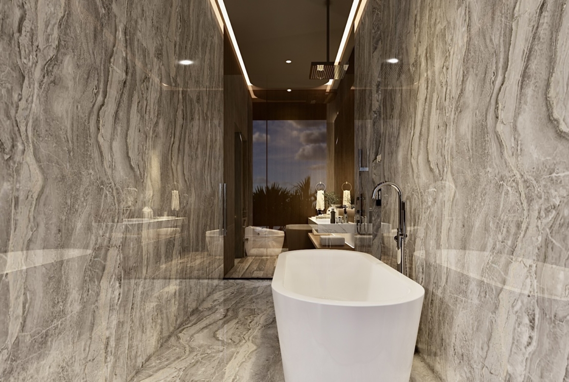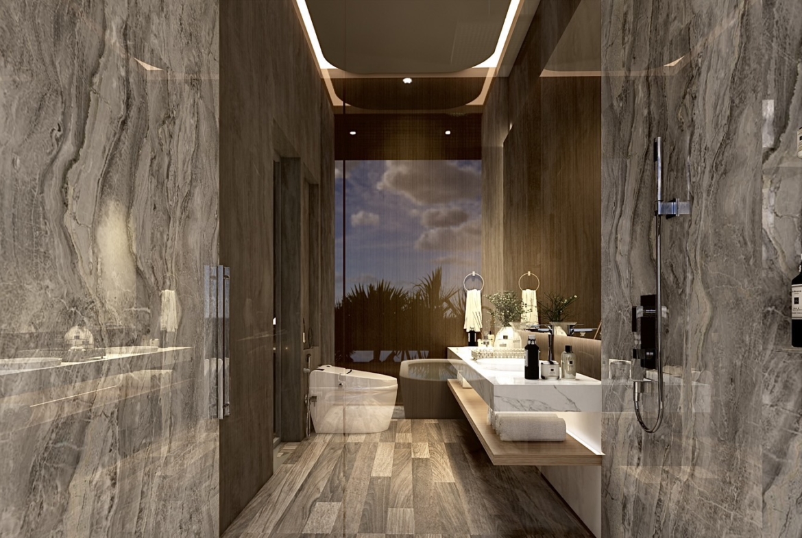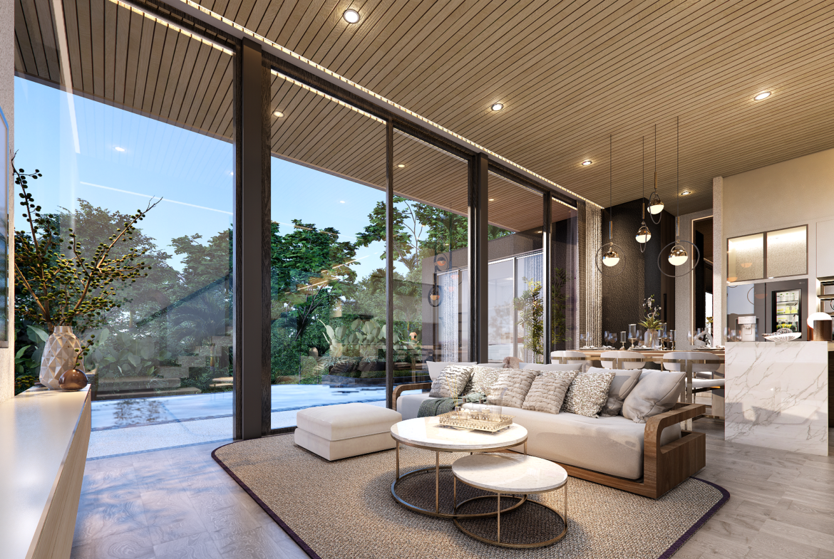 Every detail of these villas has been meticulously crafted to create a warm, inviting atmosphere, both indoors and outdoors. The infusion of modern elements is evident in the design, with expansive glass sliding doors serving as a focal point. These doors not only amplify the feeling of spaciousness but also serve a dual purpose by ushering in abundant natural light. The deliberate use of glass doors not only enhances the aesthetic appeal but also provides a functional aspect, allowing residents to effortlessly open up the living spaces to the breathtaking exteriors.